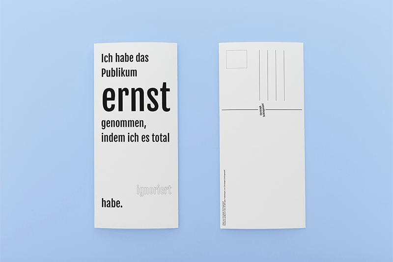 Anlässlich des 10 jährigen Todestages von Christoph Schlingensief wurden 2 Postkarten zu seinen Ehren gestaltet. Eine mit einem Zitat von ihm selbst und eine mit einem Zitat über ihn von Helge Schneider, der mit ihm gut befreundet war.